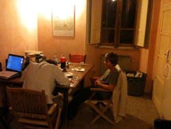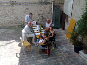 >>>> Parallalie und er sich einander, nebeneinander sitzend, näherten: Bücher wurden zum Kaffee gereicht und zu der Salami, dem Schinken, dem Käse & Fior di latte an Basilico zum Öl, und zum Wasser, das in einer kleinen, stets nachgefüllten Erdenkaraffe von Hand zu Hand ging – vergaß ich das Brot? -, derweil sich das Töchterchen langsam vertraute, besonders mit meinem Sohn. Italienische Poesie, italienisch. Leukert las drin, wie einer kostet, ob ein Gericht auch im Abgang noch schmeckt. Da lag ein Glanz von Alter Zeit auf dem Hof, die es wahrscheinlich so nie gegeben, aber die wir uns fühlen.