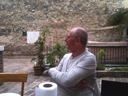 Klitschnaß kamen wir in der Kardinalsküche an, Handtücher wurden gereicht und ganze Partien Haut gerubbelt, ein grinsender Parallalie hatte die Hand schon am Kaffee, die Damen aber verlangten nach Grappa. Das Töchterlein, mitten im Pladdern hinunter, war im Buggy eingeschlafen und schlief drin erst einmal weiter, der im Cortile unter den schmalen Vorsprung einer Überdachung gestellt, geschützt im Wuchshaus des transparenten Kokons, womit der er, der Kinderwagen, umhüllt war.
