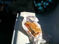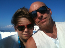 „Guten Morgen, Papa.” Er hat seine Jacke an, es ist ihm noch kühl. Wiewohl wir mittarnachts noch 20 Grad hatten und es jetzt auf 27 hinaufgehen soll und gestern, als wir ankamen am frühen Abend, tatsächlich auch waren.