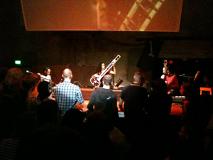 Das Berghain aber ist rein weltlich. Deshalb war es legitim, daß Frau Shankar die musikalischen Patterns durchaus popartig betonte, ihre Wiedererkennbarkeit erleichterte, ja sie sozusagen sangbar machte. Und sowieso: Indem Anoushka Shankar das weltmusikalische Erbe ihres Vaters angetreten hat, braucht sie ein Kitschherz und scheute sich nicht, es vorzuführen, ja ebenso zu inszenieren wie die Grazie ihres Lächelns. So daß der andren Herzen, aller, auch meines, ihr zuflatterten und ihrem traumhaft schönen nackten Fuß, dem linken, der, im Sitarsitzen ausgestreckt, den eleganten Ballen und die Zehen sich rhythmisch mitbewegen läßt. Dennoch gibt sie dem, was ihres Vaters, Ravi Shankars, späte, nach europäisch-klassischem Modell gebastelten Orchesterkompositionen ganz unerträglich macht, eine deutliche Strenge zurück. Tatsächlich gelingt ihr die Melange, die ihrem Vater allein im Zusammenspiel mit Menuhin gelungen war. Es gelingt ihr ausgerechnet mit dem Mainstream. Das schon ist bewundernswert – bewundernswerter aber noch, daß sie sogar der prinzipiellen Weltmusikgefährdung entgeht, der etwa Jan Garbareks einzigartiger Saxophonklang zum Opfer fiel: der akkordisch übersüßten Multikulti-Esoterik. Nein, die Bachblüten blieben heraußen, und auch fürs tanzende Weltall der globalen Konzerne von Capra, Berendt & Co war kein Platz. Das war nicht zuletzt Pirashanna Thevarajahs >>>> Mridangam zu verdanken und seiner Virtuosität von Mundraum und Stimmband – ich schreibe bewußt nicht von Gesang -, sowie der konzentrierten Tanpura Nick Ables, deren Repetionen einem über die Variationen ausgespannten Klangzelt zu vergleichen oder als ein Teppich unter sie gelegt sind, dessen Wirkung durchaus an den Basso continuo erinnert, bzw. sogar dem modernen „Beat” des populären Musik entspricht. Im Schlagwerk – indische Perkussion und Cajón – lag man ohnedies, ohne eigens modulieren zu müssen, und um so mehr aufeinander, als der Flamenco auch die Gitarre nicht selten als Schlagwerk benutzt. Im Berghain hatte sie zudem den fehlenden Gesang zu ersetzen. Andererseits, und da sind wir wieder beim Pop, ist die simple Wiedererkennbarkeit des andalusischen Tanzes medial längst vermittelt genug, um im inneren Ohr selbst tonal ganz uneindeutige Vokalisen als banale Exotismen, also wie folklorige Klischees ablegen zu können, an denen als sperrig gar nichts mehr empfunden wird. Das kam Frau Shankars Konzert ganz besonders entgegen, nämlich ihrem Publikum; sogar bisweilen konnten wir, trotz der Enge, vereinzelt Menschen raven sehen. Was in das Bergghain, den Technoclub dieser Yellow Lounge,