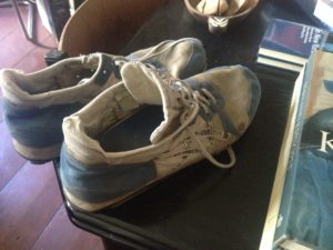 Probierte auch andere Laufschuhe aus – Sneakers, die mein Sohn gegen neugekaufte ersetzt, hier aber stehengelassen hatte. War fürs Joggen keine gute Idee; für meinen Laufschritt, den ich ein gemäßigtes Traben nennen würde, sind die Absätze viel zu hoch und viel zu gepolstert. Ich habe gerne möglichst flache Sohlen ohne Schnickschnack, mit meiner seit Kindheit ausgeprägten Tendenz zum Ballenlaufen sowieso, die ich mir langsam auf den Mittelfuß umtrainiert habe. Die hohen gepolsterten Absätze zwingen mich aber geradezu zum Fersenlauf, der extrem ungesund ist. Also zurück zu meinen alten Laufschuhen, die allerdings nach über dreißig Jahren allmählich wirklich „durch“ sind. Nur, wo bekomme ich ähnliche wieder her?