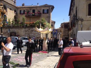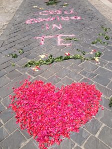 Die Bezeichnung Fronleichnam leitet sich von mittelhochdeutsch vrône lîcham für ‚des Herren Leib‘ ab, von vrôn ‚was den Herrn betrifft‘ (siehe auch Fron) und lîcham (‚der Leib‘). In der Liturgie heißt das Fest Hochfest des Leibes und Blutes Christi, regional wird es auch Prangertag oder Blutstag genannt. In das Englische und in andere Sprachen ist die lateinische Bezeichnung des Hochfestes Corpus Christi eingegangen. (Nach Wikipedia).