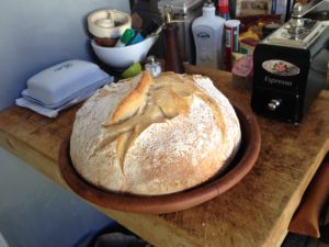 Im Ofen wieder ein Brot. Ich mußte eben, um zu befeuchten, den Terracottadeckel von der Terracottaschale nehmen: