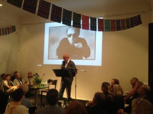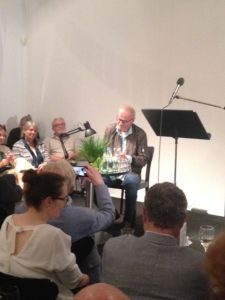Vorm Eingang des Literaturhauses schon drängte sich die Menschenschlange bis durch die Tür und die Treppen hinter der hoch. Da ich vorbestellt hatte, kam ich aber schnell hindurch, erhielt oben sofort einen Wein und suchte mir einen Platz. Nur waren im Saal schon alle Stühle belegt. Was mich nicht störte, auf Veranstaltungen stehe ich gerne. Doch war auch für Stehplätze fast kein Platz mehr.