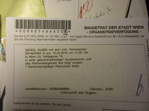 In Wien selbst am Morgen der Abfahrt ein Strafzettel hinter der Windschutzscheibe. Nicht aber für den Abend davor (des 24.5.), der nämlich wurde parkscheinmäßig abgesichert. Nein, für den 15.4., als ich in der Hetzgasse parkte, wo man mich um 21.22 Uhr erwischte, während ich mich bereits bei meinem Gastgeber in Sicherheit wiegte (wer geht denn da noch kontrollieren? – in Amelia wahrscheinlich niemand): Strafe in Höhe von 36 Euro. Heißt, man hatte mich auf dem Quivive behalten. Erst wollte ich meinem Gastgeber (“Liebesgrüße aus Wien”, sagte der nur) das Geld dalassen fürs Bezahlen, aber dann dachte ich: Mal sehen, was kommt. [Heute (13.5.) das Bußgeld überwiesen: bei näherem Hinsehen waren alle Angaben für das “Telebanking” (Taliban-King) vorhanden.]