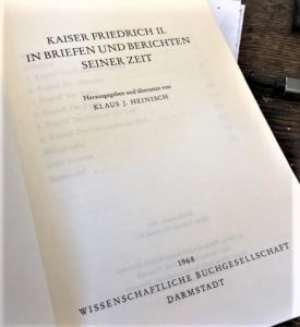 Übrigens wurde auch d o r t dann über mein Friedrich-II-Projekt gesprochen (na jà, noch ist es wohl eher poetisches Träumen), das mich neuerdings wieder beschäftigt. Nämlich hat mir Cristoforo Arco einen Band „auf Dauer