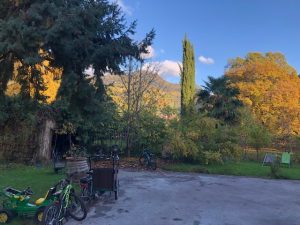 dann, in Bozen, dieser Kakibaum! (Ich pflückte vor der Abfahrt drei der Früchte, die nun auf meinem Mitteltisch in einer flachen Schale reifen). Zehn Schritte von den, sofern kernlos, Sharons weg hingen teils schon aufgeplatzte Granatäpfel an den vielen Armen ihrer Mutter, und all das Idyll eingesenkt zwischen darüber hinleuchtenden Bergen voller Rebentrassen, und ganz darüber schneegleißend Gipfel.
