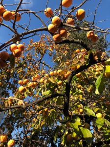 dann, in Bozen, dieser Kakibaum! (Ich pflückte vor der Abfahrt drei der Früchte, die nun auf meinem Mitteltisch in einer flachen Schale reifen). Zehn Schritte von den, sofern kernlos, Sharons weg hingen teils schon aufgeplatzte Granatäpfel an den vielen Armen ihrer Mutter, und all das Idyll eingesenkt zwischen darüber hinleuchtenden Bergen voller Rebentrassen, und ganz darüber schneegleißend Gipfel.
