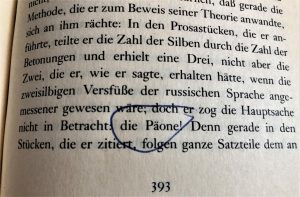 (…) so war mir schon bei der Wahl der Adjektive klar, daß Wörter wie „bedeutungsschwer“ oder „verzweiflungsvoll“ einfach und bequem die nach Gesang verlangende gähnende Lücke zwischen der Zäsur und dem Schlußwort der Zeile füllen würden („Dann träumen wir bedeutungsschwere Träume“); und ebenso, daß man für das letzte Wort ein zusätzliches Adjektiv mit nur zwei Silben nehmen konnte, um es mit dem langen Mittelstück zu kombinieren („Von Schönheit satt, verzweiflungsvoll und zärtlich“), eine melodische Formel, die im übrigen sowohl in der russischen als auch in der französischen Dichtkunst ein ziemliches Unheil angerichtet hat. Ich wußte, daß es im Russischen eine Unmenge handlicher Adjektive des amphibrachischen Typs gab (ein Dreisilber, den man sich in Form eines Sofas mit drei Kissen vorstellen kann, das mittlere eingedellt) – und wie viele solcher „betrüblich“, „verzaubert“, „rebellisch“ habe ich vergeudet (!); daß wir reichlich Trochäen hatten („zärtlich“), aber viel wenige Daktylen („sorgenvoll“), und diese standen alle irgendwie im Profil; daß anapastische und jambische Adjektive wie „unbedingt“ oder „getreu“ eher selten und außerdem ziemlich langweilig und starr waren. Ich wußte ferner, daß lange Adjektive wie „vergänglichkeitsbewußt“ und „unwiederherstellbar“ ihr eigenes Orchester in den Tetrameter mitbringen würden und daß eine Kombination wie „voreilig und unüberlegt“ der Zeile eine gewisse Moiréhaftigkeit verlieh; von der einen Seite her sieht man Amphibrachen, von der anderen Jamben. Etwas später hypnotisierte mich Andrej Belyis monumentale Untersuchung über die Halbbetonungen (das „wie“ und das „cher“ in der Zeile „unwiederbringlicher Moment“) mit ihrer Methode, die unbetonten Hebungen graphisch darzustellen und zu berechnen, so daß ich umgehend alle meine Tetrameter unter diesem neuen Gesichtspunkt noch einmal las und mir ihre Modulationsarmut schrecklich weh tat. (…)