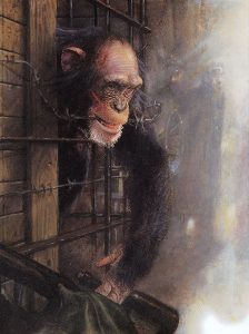 Im Zuge dieser Reduktion der Natur auf die menschlichen Bedürfnisse nimmt das Tier menschliche Züge an: Verachtung, Bosheit, Herrschsucht. Die eigene Entnatürlichung des Menschen im Prozeß der Zivilisation zwingt das Tier zur Menschwerdung. Nachdem der Mensch sich damit abgefunden hat, auch nur ein anderes Tier zu sein, beginnt das inmitten seiner künstlichen Weltordnung lebende Tier, zu einem anderen Menschen zu werden. Das Wuchern der Städte zu Megalopolen zwingt es, aus seinen verschwindenden Lebensräumen in die Zentren des Menschenlebens einzuwandern, und seine Nahrung als Abfall seiner Lebensführung zu suchen: Füchse streifen durch die Grünzonen der Siedlungen, Bären schauen über durchwühlte Mülltonnen in Küchenfenster.