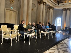 wobei, siehe den oben noch leeren Stuhl, Groissböck – der Ochs der neuen Inszenierung – erst direkt nach der Begrüßung herein-, so muß ich’s erzählen, –stürmte, dann vorgebeugt Platz nahm, den linken Sneaker von sich gestreckt, um nachher mit einer sonoren Stimme zu sprechen, die bereits d a Echos im Brustkorb erzeugte, aber erst nachdem Heller eine quasi Einführung in seine Werkauffassung halb zelebrierte, halb — „den Irrtum ehren“ — , ebenso anekdotisch wie ernsthaft als Liebhaber des Werks, speziell indessen Hofmannsthals, zu dem er als Junge habe gebetet, um die Gunst der versammelten Journalistinnen und Journalisten buhlte:
