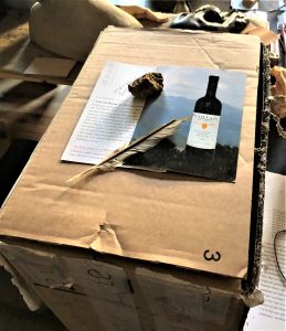 Schließlich kam hier als Geschenk noch eine wunderbare Sendung von → Le Vi Arte an: sechs Flaschen ausgesuchten Rotweins, zwei davon aus dem Jahr 2012, eine sogar von 2011, auf einer Karte beigelegt die folgende Bemerkung: