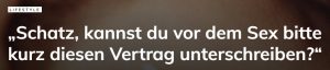da gibt es doch diese österreichische anwältin, helene klaar, zum scheidungsrecht, in diesem irre tollen interview, die sagt doch, warum wollen sie denn heiraten, wenn sie dann einen ehevertrag machen wollen, damit stehen sie doch nur schlechter da. so kommt es mir hier auch vor, wenn man meint, einen vertrag zu brauchen, sollte man vielleicht noch mal drüber nachdenken, ob man dann mit dem/derjenigen sex haben will. und dann braucht man auch schon gleich keinen mehr. der wunsch nach einem vertrag ist wohl eh ein: lieber nicht. könnte eine freundliche formulierung für eine ablehnung sein: lass uns erst mal einen vertrag machen.
