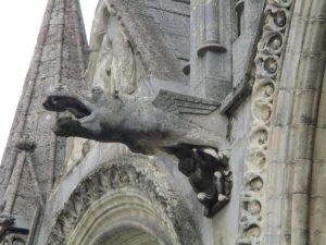 La cathédrale bascule et au premier regard sur la façade il songe naïf : pas de chance, j’arrive et juste à ce moment elle croule sous mes yeux alors qu’elle était là depuis neuf cents ans bientôt ! Est-ce ma faute ? La folle du logis le dévore : j’ai dû faire une erreur, j’ai dû trop la négliger quand je l’ai vue d’en bas… elle se venge, elle lâche tout, elle se moque de moi, elle n’attendait que moi pour s’effondrer ! L’habitué de Reims, d’Amiens, de Paris, de Chartres, là où tout est immense, droit, prestigieux et lisse, est éberlué par la maladresse du carré du sol qui veut se faire rond dans l’ascension des tours ; c’est sans étonnement qu’il découvre les bœufs, car il lui semble qu’en effet la façade est labourée, traînée vers le haut par une suite de bricolages croisés, son regard avance puis recule, comme un zoom qui ne trouverait jamais la bonne distance pour deviner les maléfices de ce vertical constamment chamboulé. Calé sur le mur du fond de la ruelle, il prend son temps, ses systoles diastoles redeviennent inconscientes, et l’émotion qu’il attendait vient enfin : oui, je sais, oui, je vois ce qu’ils ont voulu faire, c’est mieux que bien, rien n’est plus beau que le printemps non encore déclaré, on est en mars, cette cathédrale est pile sur la saison, tu es la lumière cherchée, avec tes yeux creusés, tu n’as pas peur de monter même sur des échafaudages de fortune, c’est un appel du chat qui grince, gémit dans l’ascension, obéit à l’amère loi de raison contre la passion de monter encore et meurt dans les nuages qui l’effleurent en riant.
