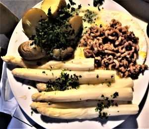 Ich wollte etwas ausprobieren, was ich nach Heimkehr und Lektüre dann tat. Weißer Spargel mit Nordseekrabben (die allerdings in Marokko! geschält worden sind — auch das einer dieser ökologisch bösen Widersinne; Krabben zum Selberpulen – worin ich seit Kindheit geschult – sind nicht einmal mehr in Hamburg zu bekommen). — Wie auch immer, Helgoländer Art: