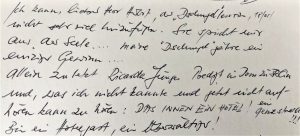 Und morgens noch, ich rollte gerade meine Teppiche im Zelt zusammen, stob ein Reiter heran, der eine Karte aus der Heimat für mich hatte. Werner Bliß hat sie gesandt, und es ist doch sehr erstaunlich, wie schnell sie ihren Weg ganz aus dem tiefsten Schwarzwald bis in mein Arabien fand. Ich gebe sie hier wieder, weil sie weniger für meine Arbeit ein Kompliment als für → Ricarda Junges Predigt ist: