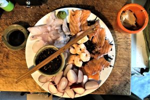 Die erste selbst geschnittene Sashimi meines Lebens und in der Wüste wahrlich Luxus (wobei Faisal, der meinem Zubereitungsritus skeptisch, doch „umso stummer“ zusah, nicht einmal den Kopf schüttelte; allein, er weiß sehr gut, wie verboten rotes Fleisch mir ist — und ecco!):