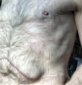 Die Ausstülpung (von überm Nabel links der Narbe bis unten etwa Bildmitte folgend) läßt sich ziemlich gut erkennen. Die Diagnose war aber eh klar. Nur wird derzeit wegen der gegenwärtigen neuen Coronabestimmungen die Behandlung von Brüchen dieser Art eigentlich aufgeschoben; in meinem Fall allerdings, nach der Magenresektion, besteht die Gefahr von Einklemmungen, die wiederum zu solch lebensbedrohenden Unappetitlichkeiten wie Darmverschlüssen führen können. So daß nun meine Operation bereits Mitte der nächsten Woche stattfinden wird.