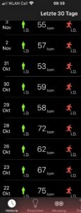 Am 21. Oktober habe ich das Training nach der OP und der vorher langen Pause wieder aufgenommen, und schon ab dem 29. fiel ging der Ruhepuls auf unter 60. Nur noch vier Wochen weiteres Training, und ich hätte die 50 wieder stabil. Auch einige verlorene Muskulatur wäre wieder zurück. Ich war immer in einem zutiefst vertraulichen Verhältnis mit meinem Körper und kann ihm dafür gar nicht genug danken; daß ich ihn werde nun wieder vernachlässigen müssen, ist übel. Aber andrerseits eben auch zu seinem Schutz.