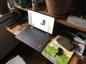 erst einmal muß ich mich entschuldigen, fast bin ich ein wenig zerknirscht. Denn genau einen Tag, bevor vorgestern früh ich die Reise nach Wien antrat – präziser: am späten Nachmittag des Donnerstags – sah es so aus, als hätte ich die Videoarbeit zur zwölften Bamberger Elegie endlich, endlich, endlich fertig. Und entdeckte d o c h noch einen Fehler, leider, der sich am selben Tag nicht mehr hätte beheben lassen; eine Kleinigkeit nur, doch nach all der intensiven ja nun wochenlangen Arbeit an dem, muß ich schreiben, Film hätte sie mich sehr gestört, ich wäre unzufrieden geblieben. Also dachte ich, gut, du kopierst jetzt alles auf die transportable 2TB-Festplatte und löst das Problem am Wiener Schreibtisch, der zwar nur Sekretär, siehe Bild, ist und also nur wenig Arbeitsplatz bietet – aber nicht dies stellte sich nun als Hindernis dar, sondern daß meine mitgeführten Arbeitskopien in Adobes Schnittprogramm einzelne Clips entweder gar nicht oder aber, was noch schlimmer ist, verändert wiedergaben und -geben. Sie gaben mithin wider. S o, daß sich’s sinnvoll in keiner Weise arbeiten läßt und ich also doch meine Rückkehr nach Berlin, in sechs Tagen, abwarten muß. Und Sie müssen’s leider nun gleichfalls. Ein großes Hindernis ist aber auch schon der kleine Laptopbildschirm; für die sehr feinen Schnitte brauche ich wirklich einen großen Screen und am besten zwei Screens, wie ich sie halt auch habe in meiner Berliner Arbeitswohnung.