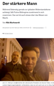 Ich halte das für falsch. Auch einer Dynamik des Opfers, die als psychische Abwehr das gleichsam internalisierte Unrecht des Täters symbolisch wiederholt, muß entgegengesteuert werden, völlig egal, was die Öffentliche Meinung dazu meint. Sie wäre, als etwas Unantastbares, verheerend. Wirklichkeit ist komplex und also kompliziert, Wahrheit taugt nicht für Parolen. Aber sei’s drum. Wenn der deutsche PEN den ukrainischen nicht oder nur indirekt nennt, tue eben ich es. Es geht da m i t um einen Zusammenhang, in dem Nationalismus eine nicht unbeträchtliche Rolle spielt. Auch daß die ukrainische Regierung sich nicht scheut, mit rassistisch-nationalistischen Söldnern zusammenzu,nun-jà,’arbeiten‘, macht zumindest mir eine eindeutige Solidaritätsbekundung schwierig. Darauf bin ich → dort eingegangen, lesen Sie es, Freundin, nach; die Belege sind dort beigefügt. Je tiefer man gräbt, und ich tue zur Zeit nichts anderes, desto schlimmer widersprüchlich werden die Befunde. Das heißt aber nicht, daß Putins und seiner Clique Krieg in irgend einer Weise gerechtfertigt sei, er ist ein Völker- und Menschenrechtsverbrechen, für das die gesamte Mörderbande vor den Volksgerichtshof gehört. Nur sind mir Selenskyjs politische Sebstinszenierungen (lesen Sie diesen klug beschreibenden