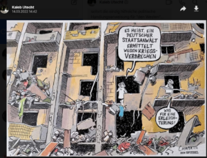 Denn all das ändert rein gar nichts an der aktuell widerlichen Vorgehensweise Herrn Putins – und nur die sollte die Referenz-Fakten zu unserer Lagebeurteilung liefern: Flächendeckender Einsatz von international geächteter und darüber hinaus völkerrechtlich verbotener Munition (Streubomben sowie schreckliche körperliche Verwüstungen anrichtende nicht-magnetische! Schrapnellmunition, die den Chirurgen ihr Auffinden im Körper nahezu unmöglich macht). Völkerrechtswidrige Zielwahl (Kliniken, Schulen, Wohngebiete, …)! Das massenhafte Töten von Zivilisten und das Töten von Soldaten, die sich ergeben haben (Ergebene und Verwundete gelten völker- und kriegsrechtlich nicht mehr als Kombattanten und genießen Schutz). – Ja, letzteres geschieht wohl auch auf ukrainischer Seite – wenn auch in geringerem Maße, was wohl stark mit den unterschiedlichen Führungsstrukturen zu tun hat.*) In jedem Fall MÜSSEN auch ukrainische Kriegsverbrechen recherchiert und bestraft werden.