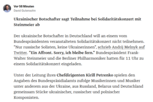 Derartige Haltungen sind nicht nur Tendenz, auch → dieser Aufruf zeigte sie schon, und immer wieder tönt das „russische Böse“, daß ein ganzes Volk nämlich böse sei, aus den Verlautbarungen ukrainischer Politiker und Publizisten. → Ebenso der ukrainische PEN, der sogar Puschkin und Tolstoij in Haft der „russischen Erbschuld“ nahm, soeben allerdings → vorsichtig zurückgerudert ist. Dennoch mehren sich auch hierzulande Absagen ukrainischer Schriftstellerinnen und Schriftsteller für Lesungen, auf denen ebenfalls russische auftreten sollen, gleichgültig, welche Haltung diese haben und