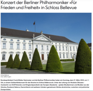 vertreten — auch dies ein nationalistisches „Narrativ“. Es läßt sich fast schon völkisch nennen. Als wäre nicht deutlich genug, wie selbst in russisch dominierten Gegenden, der Ukraine also, sich Russen gegen die Kriegsrussen wenden. Die Haltung vieler russischer Künstler, gegen Putin und den Krieg, ist spätestens seit dem → Aufruf russischer Kunstschaffender vom 25. Februar bekannt; einige der Unterzeichnenden haben Rußland unterdessen verlassen müssen. Der Text selbst ist in Rußland nicht mehr abrufbar; → dort die Übersetzung. Rufen Sie den Link auf, sehen Sie nun das: