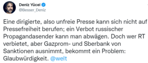nen. Strukturell tat Deutschland nunmehr das gleiche, was Rußland mit ausländischen und inländisch oppositionellen Sendern gemacht hat. Die Begründung, es solle russische Propaganda verhindert werden, ist gegenüber eigenständig denkenden demokratischen Staatsbürgern fatal. Deniz Yücel hat hier recht. Zwar