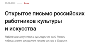Wir, Künstler, Kuratoren, Architekten, Kritiker, Kunstkritiker, Kunstmanager – Vertreter von Kultur und Kunst aus der Russischen Föderation – haben diesen Offenen Brief initiiert und unterzeichnen ihn, da wir ihn als unzureichende, aber notwendige Maßnahme für den Frieden zwischen Russland und der Ukraine betrachten.