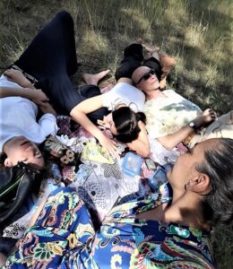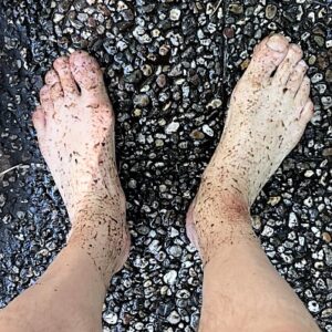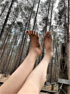 Zu dem ich, wie ankündigend-vorgenommen bereits gestern erzählt, selbstverständlich das ausgedruckte Typoskript der Triestbriefe mitgenommen, wenngleich nicht ein einziges Mal hineingeschaut habe; das wäre auch nicht nötig gewesen, sondern es geht um etwas anderes, seelisch-psychisches — eine poetische Einnordung. Sie können, Freundin, von dem ästhetischen Kompaß sprechen, der tatsächlich imaginär, dennoch wegleitend ist („Realitätskraft der Fiktionen“). Auch wenn ich es, das Typoskript, mit der Tasche in eines der Fächer einschloß, das, ähnlich einem Museums- oder Bibliotheksbesuch, den Besuchern des Barfußparkes frei zur Verfügung steht, trug ich’s doch in Gedanken mit mir mit, abgelenkt nur, wenn लक्ष्मी und ich sprachen oder wir mit den Zwillingen sprachen oder eine „Aufgabe“ zu bewältigen war, die Konzentration verlangt, etwa bei Balanceakten, also Gleichgewichtstraining, sowie über Scherben oder, ganz fies, kleine Kiefernzapfen zu schreiten und, was ich besonders genoß, durch nassen Torf zu stapfen, der wie schwarzer Schlick im Wattenmeer ist, in den hinein, schönste Freundin, Sie bis zu den Waden sinken, gefolgt vom Durchschreiten eines kalten Gewässers, das den gröbsten Matsch von der Haut wieder wegwäscht. Was noch haften bleibt, sieht schließlich wie eine hauchdünne Nylonsocke aus. Hier ein noch Stadium davor: