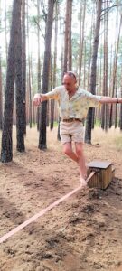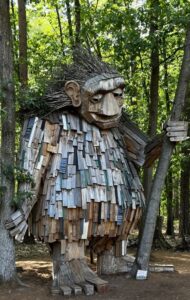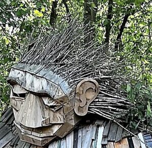 Es gibt im Barfußpark ein riesiges, aus Holzlatten, Ästen und Reisig erschaffenes — nun jà, der Diminutiv geht fehl, weil es eben so groß ist — Maskott“chen“ namens Waldemar. Was an dem Troll fasziniert, ist, daß er je nach Blickwinkel entweder lächelt oder eine Traurigkeit vermittelt, die sehr verständlich wird, wenn Sie sich den ausgetrockneten Zustand des Waldes anschauen. Hier ruft doch alles nach Hilfe. Weshalb ich, als ich dieses Journal begann, das Rauschen draußen fallenden Regens vermißte, obwohl die derzeitigen Temperaturen für mich selbst ideal sind; jetzt, mit 25 Grad, find‘ ich’s sogar a bisserl kühl und sehne wider alles ökologische Bewußtsein die nächsten 35 herbei. Mit aber zunehmend schlechtem Gewissen.