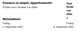 U n d diese Unterkunft, ein Einzelzimmer in einer 160-qm-Wohnung, deren Salon mitnutzbar ist, liege auch noch nahe der Piazza dell’Unità d’Italia, auf der die Venere di trieste steht, auf die sich der Roman immer wieder bezieht. Vor Ort werde ich jetzt nur noch gucken müssen, ob ich für die Suche nach Lenzens oben im Karst befindlichen Grenzhäuschen werde irgendwo eine Vespa mieten können. Aber erst – auch, bevor ich An- und Rückreise buche – muß ich die Bestätigung der Unterkunft abwarten; als Mail bekam ich nämlich erstmal nur dies: