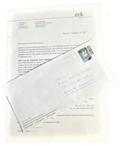 Hier eingegangen nicht als Mail, sondern ich fand den, um das Wort noch einmal zu strapazieren (es faktisch aber zu ehren), „klassischen“ Brief in meinem Briefkasten, als ich abends von dem Beelitz-Heilstättener Ausflug zurückkam:
