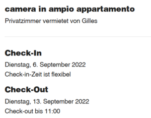 Es war, liebste Freundin, denn doch etwas mühsam, bis die Warterei von AirBnb selbst beendet wurde: Meine → vorgestern gebuchte Unterkunft wurde nicht bestätigt; es kam aber auch keine Nachricht, die mir abgesagt hätte. Also stornierte das Vermittlungsunternehmen, woraufhin ich andere Unterkünfte suchte und dabei bemerkte, daß die erstgewählte in der von mir gewählten Zeitspanne (2. bis 9. September) offenbar ein Belegproblem hatte. Also verschob ich meine Recherchereise zweimal um einen Tag, was dazu führte, daß die erstgewählte Unterkunft jetzt wieder auftauchte, aber in Kombination mit einer zweiten. Da ich keine Lust habe, während meines Aufenthalts das Zimmer zu wechseln, ich will ja durcharbeiten, schob ich weiterhin und — hatte Erfolg. Nunmehr kam auch sofort die Bestätigung, zwar mit 30 Euro pro Nacht etwas teurer als zuvor, aber ja noch immer sehr preisgünstig. Obendrein liegt mein Quartier, via Tigor 14,