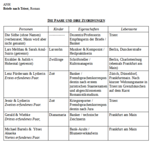 Ebenso wird es eine Zeitentabelle geben — was umso wichtiger ist, als zwischen dem zwei- und dem dreiunddreißigsten Brief sieben Jahre liegen. Allerdings bin ich mir noch unsicher, ob ich diese Zeit nicht verkürze; es wird sich dies aus dem Fortgang und spätestens am Ende des letzten, des neununddreißigsten Briefes ergeben. Möglich übrigens, daß ich ich ihn bis zu meiner Triestreise bereits geschrieben haben, also im groben mit der Ersten Fassung des Buches schon fertig sein werde. Sollte ich das schaffen, führe ich mit perfekten Bedingungen an die Spielorte. Übrigens müssen auch noch ein paar wenige in Düsseldorf, Frankfurtmain und Zürich präzisiert werden, so, wie ich auch festlegen will, wo in Berlin der Brieferzähler und wo seine Ex wohnen; ich denke da an Friedenau oder Charlottenburg, während Lars, der Bratschist und Komponist, hier in der Duncker quasi in meiner Arbeitswohnung lebt, die aber bei ihm um ein Musik- und ein Schlafzimmer größer ist. Seine Ex und die Zwillinge wohnen wie लक्ष्मी und die unseren einen Kilometer entfernt vielleicht an der Prenzlauer Allee. Mal sehn.