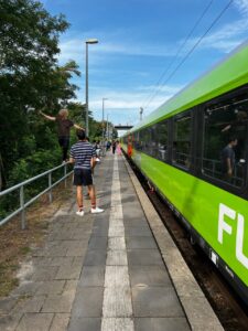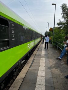 ja lockeren Stop kurz vor Nennhausen; wozu, an dieser Lockerheit aller, enorm viel beitrug, daß wir Passagiere aussteigen und uns die Füße vertreten durften. Drei junge Männer balancierten auf einem Geländer, andere telefonierten; die Sonne schien; ich bekam eine Idee für den siebenunddreißigsten Brief des Triestromans, hatte aber schon vorher, weil der Flixtrain kaum halb voll war und ich einen ganzen Tischplatz für mich alleine hatte und die sich vornachts nach Vorlesen und Gespräch mit Ricarda noch ergebenen Korrekturen ausgesprochen bequem nun in die Datei übertragen ließen, … hatte aber schon vorher notiert, daß irgendetwas mit diesem Zug nicht stimme (auch wurden die Tickets nicht kontrolliert), und mir vorgestellt, daß der Briefautor genau hier, wenn auch in einem anderen Waggon, nun selbst einer Sídhe begegne;