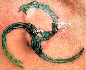 bereits Wien, wohin ich unmittelbar nach Triest weiterreisen werde, wird es weitergehen. Denn die Idee ist ja, daß aus den Spiralarmen der Triskele immer wieder Ranken herauswachsen werden, die dann auch Blätter tragen — bis sich ein komplettes Bild ergeben haben wird, das ich aber ebenfalls sich weiterentwickeln lassen möchte, ein quasi-organisches work-in-progress. Und wer weiß, was meiner Tattoo-Künstlerin alles noch einfällt. Ich muß ihr nur meine Vorstellung übermitteln, daß ich ihr die größtmögliche Freiheit gebe – für sie möglicherweise ungewohnt, weil Fotorrealistin. Was sich an diesem Tattoo sehr gut erkennen läßt, das meine Vorlage präzis realisiert hat, aber nicht, wie ich wollte, über sie hinausgegangen ist. Doch wie genau Elena gearbeitet hat, ist auf der Vergrößerung trotz der Folie sehr gut zu erkennen (dieses Bild entstand unmittelbar nach Fertigstellung im Studio):