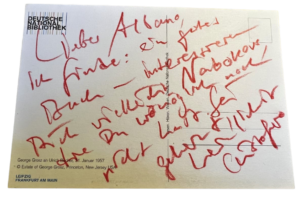 Wie auch immer, die Lektüreabende. — Interessant, daß der ziemlich suchthafte Impuls, zum Abendessen Filme zu gucken, bereits jetzt schon fast völlig weg und durch die Vorfreude auf das jeweilige Buch suspendiert wurde, was von Nicolas Borns, ich schrieb auch das schon, Die Fälschung durch ihre hinreißende Faktur noch einmal verstärkt worden ist. Sie wirkt umso mächtiger, als Laschens, eines Kriegsberichterstatters, Geschichte auf schmerzhafte Weise in unsere unmittelbare Gegenwart des Ukrainekrieges paßt. Allerdings muß ich etwas richtigstellen. Ich schrieb, Christopher Ecker habe mir das Buch geschickt, weil ich die Unterschrift der ihm beigelegten Karte als „Christopher“ identifizierte. Umgehend mailte Ecker mir, nein, er sei das nicht gewesen; aber nun müsse er das Buch wohl unbedingt lesen. Muß er, ja. Aber gut, ich nochmal an die Entzifferei: