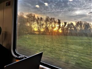 Der Anschluß zum Bus, nunmehr S Wedding, war perfekt, und Punkt sieben stand er vorm Hauptbahnhof. Jetzt nur noch nach dem Gleis gucken, ah, 7.24 Uhr Gleis 7, nur weshalb wird eine andere Zugnummer angegeben als auf meinem Biglietto steht? – Mich noch mal an dem ausgehängten Fahrplan vergewissern, doch, ja, ist der richtige Zug, Gleis 4, hat halt nur ’ne andere Nummer. — Ich also runter, Hauptbahnhof tief, noch eine Viertelstunde, fein, kann ich abermals etwas auf- und abgehen (stillzusitzen liegt mir nur am Schreibtisch; hübsch: „zu sitzen liegt„). Aber kaum hab ich den Rucksack runtergewuchtet, fährt die grüne Ratterschlange schon ein. Also den Rucksack wieder drauf. Mein Sitz, reservierter (wichtig: Tisch)Platz, ist schnell gefunden. Abeitszeug aus dem Köfferchen nehmen, dieses oben auf die Ablage, der Rucksack steht hinten auf einem der leeren Plätze, die, ich weiß nicht warum, mit rotweißem Plasteband abgesperrt sind.
