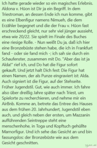 Gut, wie auch immer. Ich fahre also über dreißig Jahre später nach Triest, um Spielorte zu recherchieren, und nehme mir ein AirBnb. Komme an, betrete das Entree des Hauses aus dem frühen 20. Jahrhundert, Jugendstil eben auch, und gleich neben der ersten, zum Mazzanin aufführenden Steintreppe steht eine menschenhohe, in Toga und Kopftuch gehüllte Marnorfigur. Und ich sehe das Gesicht an und bin fassungslos: Aldas Bronzebüste wie aus dem Gesicht geschnitten.