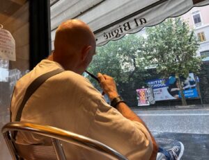 Antiker Schrank, der nicht schloß, auf Fischgrätparkett, an die Wand nebens Fenster ein weißes, zum Briefeschreiben – auch den letzten nach Triest –, Ikeading mit Spiegel drauf geschoben und den Klappstuhl davor, immerhin aus Holz, und zwischen Ding und breitem, tiefem alten Bett, in dem die Schlafenden versinken, das Nachtischsregalchen, auf dem der Mini-Dictionario liegt. Und hat er nur geträumt, daß er Dich sah, als er dann wirklich aufgebrochen war? – zur Giacomo in monte 2, für die Uni war es schon zu spät, und wie in seiner Fantasie zuvor zwar nicht im Giardino Bavesi, aber davor an der