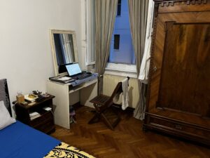 Antiker Schrank, der nicht schloß, auf Fischgrätparkett, an die Wand nebens Fenster ein weißes, zum Briefeschreiben – auch den letzten nach Triest –, Ikeading mit Spiegel drauf geschoben und den Klappstuhl davor, immerhin aus Holz, und zwischen Ding und breitem, tiefem alten Bett, in dem die Schlafenden versinken, das Nachtischsregalchen, auf dem der Mini-Dictionario liegt. Und hat er nur geträumt, daß er Dich sah, als er dann wirklich aufgebrochen war? – zur Giacomo in monte 2, für die Uni war es schon zu spät, und wie in seiner Fantasie zuvor zwar nicht