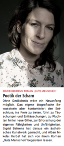 Vielleicht darum? Mochte Hanser seine (die genau nämlich ist’s) – zahlungskräftige – Leserschaft nicht düpieren, vor allem nicht mit Wahrheit? Ich kann nur spekulieren. Jedenfalls kommen wir auch hier nun zur Scham, wenn auch mehr zum Schämen (Fremdschämen leider) – doch gratulieren dem kleinen Hamburger Verlag Minimal Trash Art (MTA) zu dieser Autorin. Sie ist nicht die erste, die von einem großen Haus zu einem Independent wechselt und leider lernen muß, warum. Dem Buch selber macht das nichts aus, sofern Sie es denn lesen.