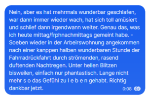 Nun hätte man ja sagen können, der Bub soll mal was mit viel Bewegung beruflich machen, vielleicht Gärtner werden wie sein Vater; ich war aber genauso wie auf Bewegung auf Bildung und Denken gierig — gierig ist genau das Wort: war hungrig und besessen. Bei einer rein körperlichen Tätigkeit wäre ich genauso unausgeglichen gewesen. Sie dürfen nicht vergessen, daß ich nicht – oder nur selten – erschöpfbar gewesen bin, ich habe „Erholung“ nie gebraucht, bzw. war sie mir immer eine andere Form der Anstrengung. So gesehen, war meine Raucherei am Schreibtisch nichts anderes als, während der Geist mit der Idee und ihren Rhythmen kämpft, den Körper mit der Abwehr der Schadstoffe kämpfen zu lassen, die zugleich genau die Fokussierung auf die Kopfarbeit bewirken, die vom ADHS so gerne unterlaufen wird.