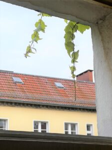 Ja, der Wein ist zurück, und er klettert pfiffig: vom Nachbarhaus aus von oben nämlich nach unten herab und bei mir fast schon durchs rechte Oberlicht hindurch. (Auf dem Foto erkennen Sie ganz gut, welche Spuren die Füßchen der damals herabgerissenen Weinranken links neben dem Arbeitswohnungsfenster auf der Fassade hinterlassen haben; auch ökonomisch also war die Vernichtung der Laubmatte dumm). — Und schon sind auch die Spatzen nun wieder da, die in den nahen Ranken nisteten und mich bisweilen besuchen kamen. Jedes Mal, wenn ich zum Fenster schaue, streichelt mich ein leises, der Findigkeit der Natur halber grinsendes Glück — einer derart zärtlichen Schlitzohrigkeit:
