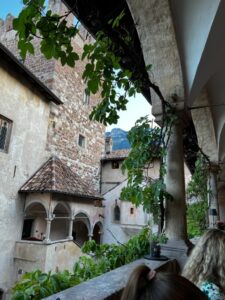 Am Abend also in den Volvo; es verstand sich von selbst, daß nunmehr, gestern, auf Alkohol verzichtet werden mußte; außerdem kannte ich das Auto nicht. Umso mehr Freude machte die Fahrt hinauf, vor allem, wenn es den Hang rauf durch enge Gassen und Single Track Roads geht, die sich zwischen den Hügeln enormer Wein- und Apfelpflanzungen, ja, –plantagen sowie die wenigen Dörfer derart winden, daß selbst der Google-Navigator aufgab und mich dreimal herumkurven ließ — bis ich ihn abstellte, von mir aus rückwärts setzte und dann nach Gefühl in ein Weglein einbog, das tatsächlich am sich dort, von der Serpentine aus nicht sichtbar breitenden Parkplatz des Schlosses endete; dieses hatte ich dauernd schon im Blick gehabt. Es ist mehr eine Burg, klassische Ritterburg, denn ein Schloß. Und hinreißend restauriert: mir ein bleibendes Rätsel, weshalb die Deutschen so etwas einfach nicht hinbekommen.