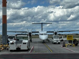nämlich weil mit einer eleganten, geradezu schmucken Propellermaschine, die überdies — bei acht- oder neunundzwanzig Passagieren (sollt‘ ich auch hier „und Passagierinnen“ schreiben?) –