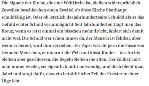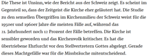 Die These ist Unsinn, wie der Bericht aus der Schweiz zeigt. Es scheint im Gegenteil so, daß der Zeitgeist die Kirche eher geläutert hat. Die Studie zu den sexuellen Übergriffen im Kirchenmilieu der Schweiz weist für die 1950er und 1960er Jahre die meisten Fälle auf, während das 21. Jahrhundert noch 12 Prozent der Fälle betreffen. Die Kirche ist sensibler geworden und das Kirchenvolk kritischer. Es hat die übertriebene Ehrfurcht vor den Stellvertretern Gottes abgelegt. Gerade dieses Machtgefälle war für die Missbräuche mitentscheidend.
