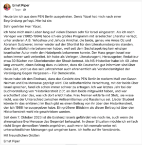 Dazu die Nachricht, daß der Verleger Ernst Piper aus „meinem“ PEN Berlin ausgetreten ist. Sie erreichte mich grad eben. Der Mann möge mir die Urheberrechtsverletzung verzeihen, doch hier sein Brief: